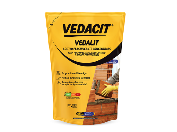 VEDACIT VEDALIT é um aditivo concentrado que proporciona ótima trabalhabilidade a argamassas e rebocos. Por ser líquido, facilita o trabalho, proporcionando economia de material e excelente acabamento. Agrega uma série de vantagens às argamassas: maior aderência, coesão, ausência de fissuras e menor exsudação. Argamassas preparadas com VEDACIT VEDALIT não precisam ser curtidas.